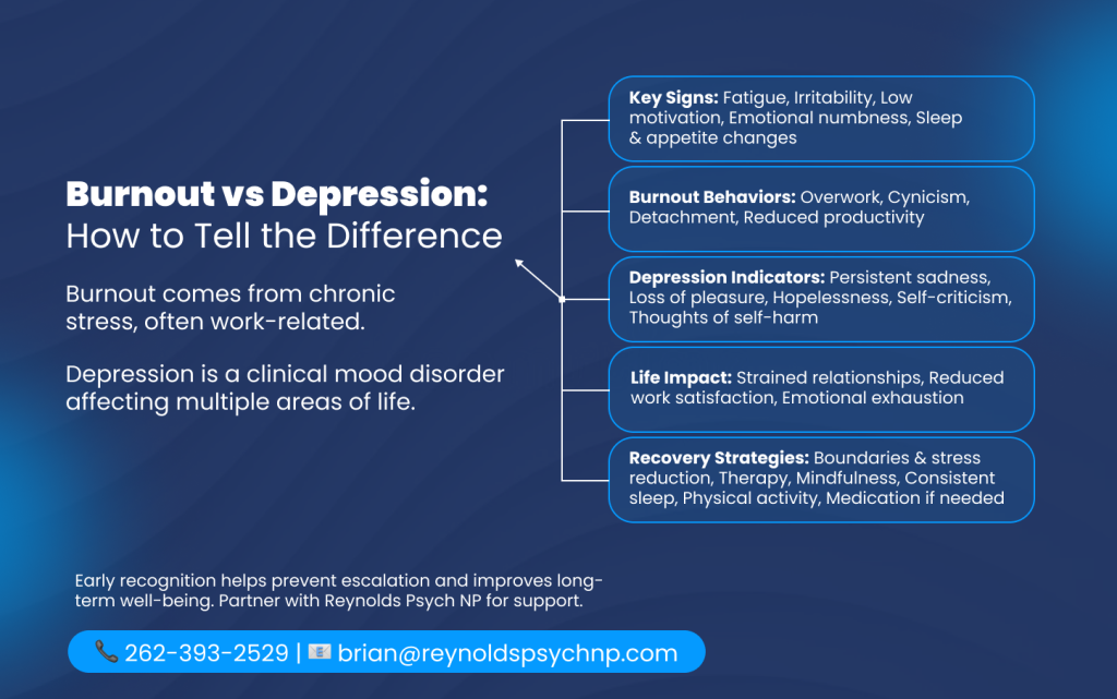 If you are unsure whether you are experiencing burnout or depression, a professional evaluation can provide clarity and direction. Reynolds Psych NP offers compassionate, evidence-based support tailored to your needs. Contact Reynolds Psych NP at (262) 999-7350 or email[email protected] to schedule a confidential consultation and take the first step toward lasting mental wellness.