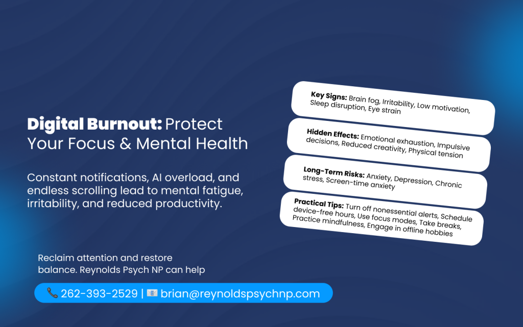 Contact Reynolds Psych NP today at (262) 999-7350 or email [email protected] to regain clarity, restore balance, and build healthier digital habits for lasting well-being.